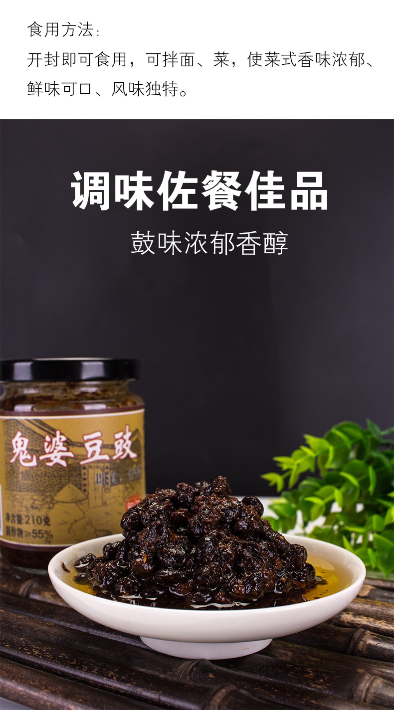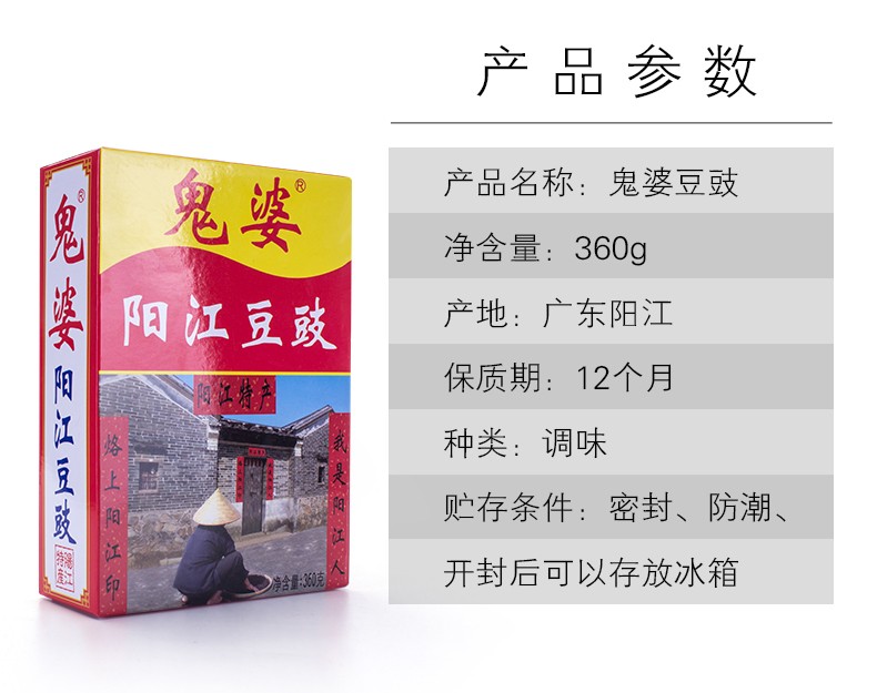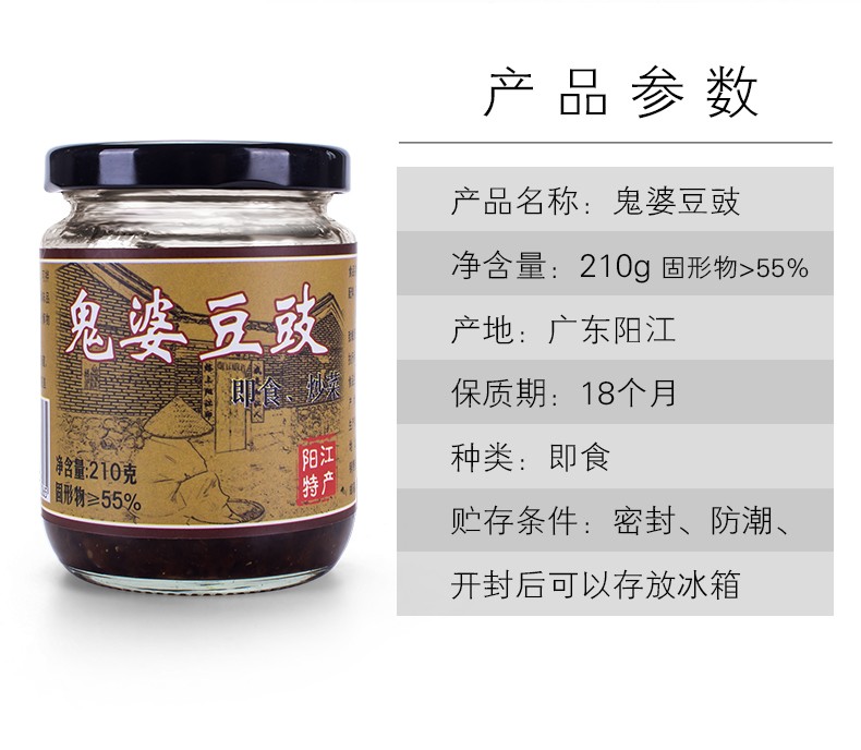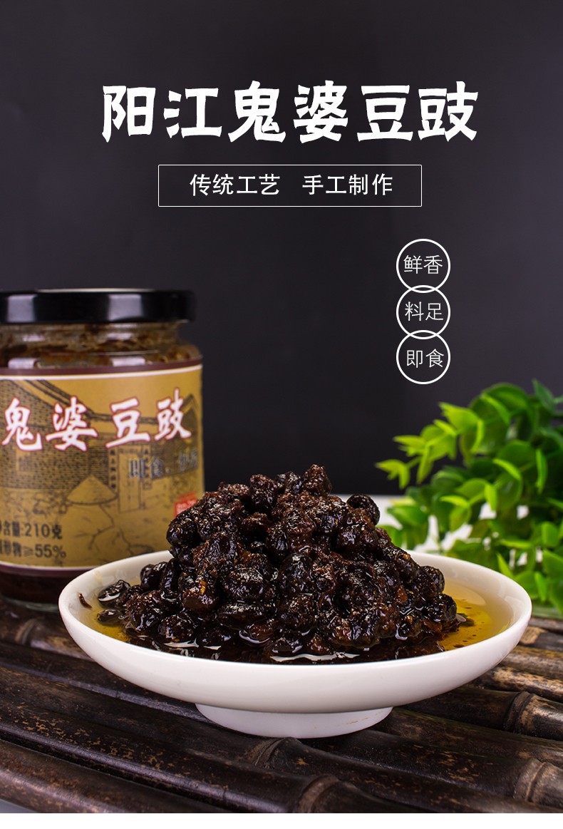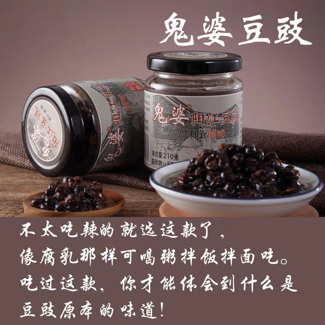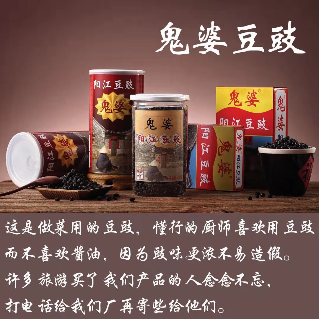 阳江市道德芯商贸有限公司是一间专业生产阳江著名土特产“阳江三宝”之一 ——豆豉的厂家,我们的鬼婆阳江豆豉系列产品,色泽乌黑油润,豉肉松化,豉味浓香,风味独特,鮮香可口,富于营养。